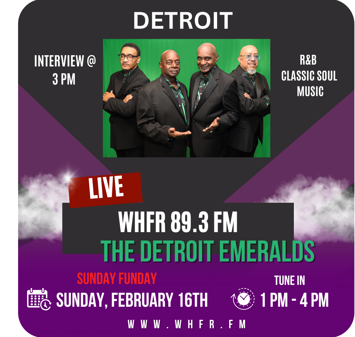 The Rhythmic Ride (aka RNB Soul Groove Radio Show) is bringing you an afternoon of timeless R&B and soul this Sunday, February 16, from 1:00 – 4:00 PM on WHFR 89.3 FM. Join Ms. Marjon as she takes you on a journey through the best of R&B, featuring an exclusive interview with The Legendary Detroit Emeralds at 3:00 PM.